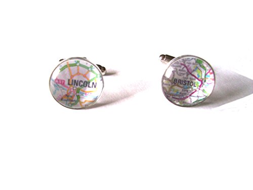 I make all my Jewellery in my studio in Dorset. Personalised Cufflinks: Destination Map Jewellery. Please let me know which town or city you would like included and I will email you a PDF with a choice of Maps. The picture/Cufflink size is 16mm in diameter. The map is protected by a Glass Cabochon Dome which magnifies the image slightly. I also make Personalised Tiepins, Charm Bracelets, Earrings and Pendants etc. Please use Amazon Contact the Seller option (or similar) to advise me of the destinations you would like.Sent out in Black Velvet Cufflinks Box.