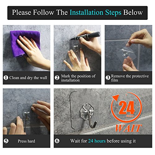 - EASY TO INSTALL & REMOVE: No drilling and tools needed, install it in seconds without damaging the wall. You'd better leave it for 24 hours for better stickiness. The hooks can be easily removed without leaving glues by using a hair dryer to heat the self-adhesive.