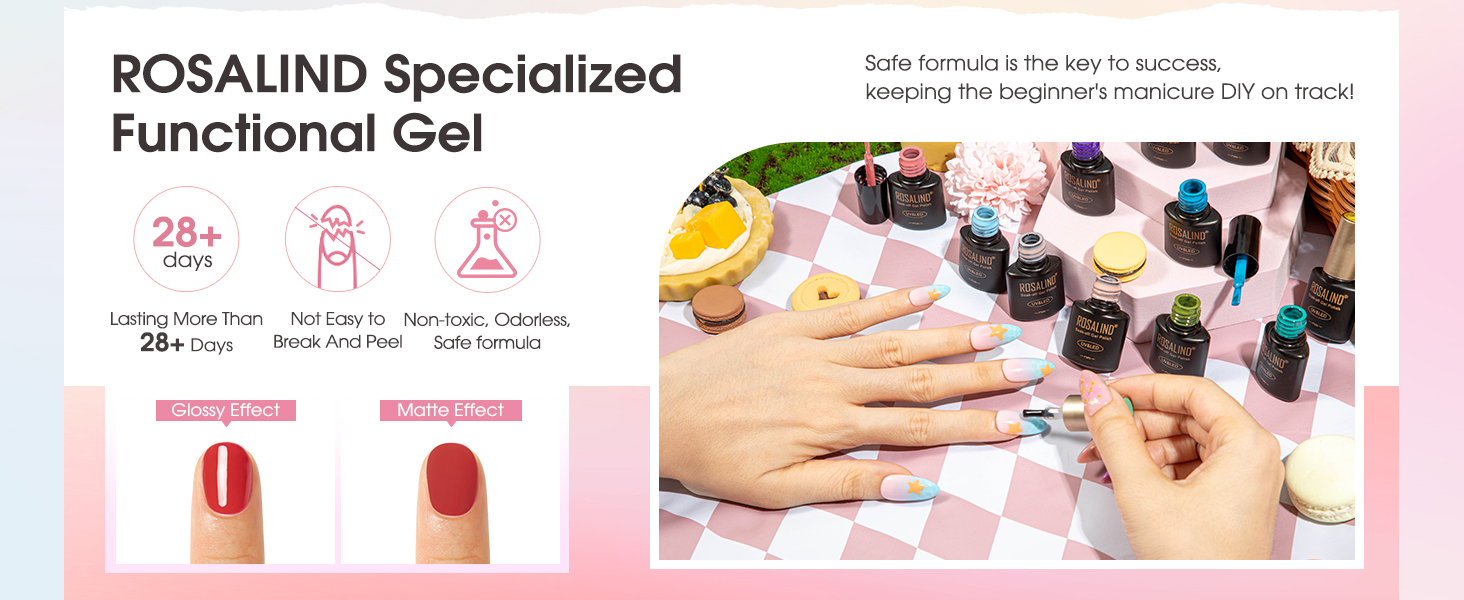 The ROSALIND 24pcs Jelly Gel Polish Set offers 20 semi-transparent to opaque jelly gel colors, including base, glossy, matte, and glitter top coats. Designed for easy application and cured under LED/UV lamps in 60-120 seconds, this set delivers up to 21 days of chip-resistant wear. Its low-odor, nail-friendly formula suits both beginners and professionals, making it a perfect DIY manicure kit or stylish gift.