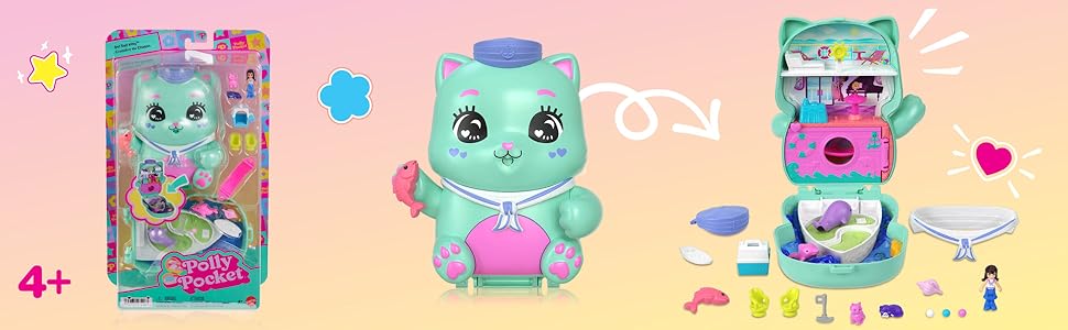 The Polly Pocket Set Sail Kitty Compact is a portable, multi-level playset featuring 1 micro doll, 2 pet cats, and 10 fashion accessories. Designed for kids aged 4-8, it encourages creativity and social skills through imaginative play, all within a stylish sailor kitten-themed compact perfect for travel and on-the-go fun.