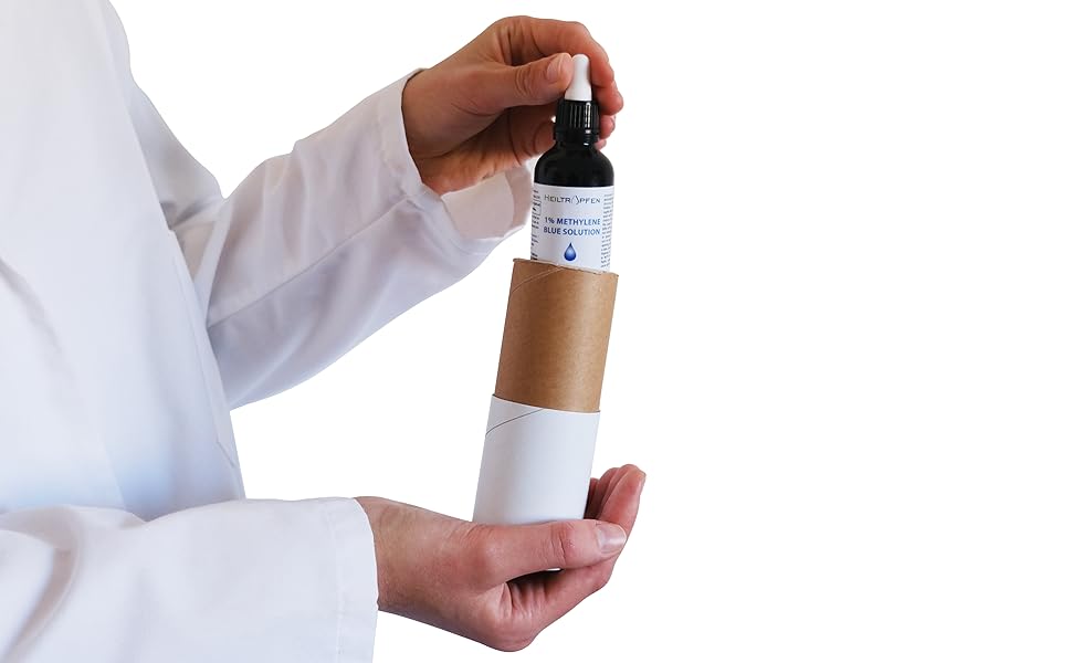 Heiltropfen® Methylene Blue 1% Solution offers a 50 ml amber glass bottle of ultra-high purity, USP pharma grade Methylene Blue trihydrate. Third-party tested and free from formaldehyde, it delivers precise dosing with 0.5 mg per drop, packaged securely for travel. Manufactured under GMP and ISO certifications, it meets stringent quality and safety standards for professional and research use.