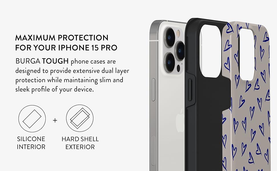 The BURGA iPhone 15 Pro case combines a dual-layer hybrid design of shock-absorbing TPU silicone and a military-grade hard shell for superior protection. Featuring a 2mm raised bezel to safeguard your screen, it offers a slim, non-slip grip and wireless charging compatibility. Its exclusive, scratch-resistant HD prints ensure your phone stays stylish and fresh, making it the ultimate accessory for professionals who demand both durability and aesthetic flair.
