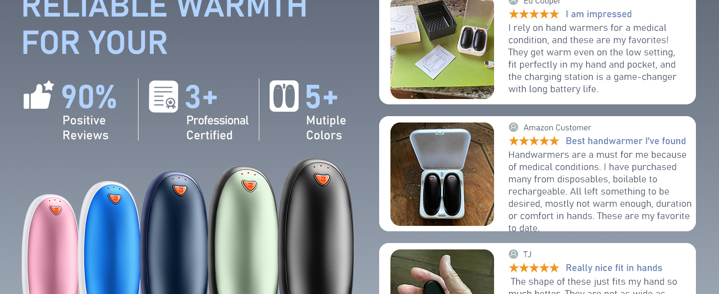 Brought this item for my elderly parents. My mom easily gets cold, and I thought it would be perfect for her if she wanted to sit on the porch during the cold months and watch wildlife or my dad could use them if working out in the garage piddling around and needed to warm his hands up. They like them. They warm up very fast and this type is much more convenient because you can just leave the case plugged in vs having to charge the warmers. That means if you do need to take them off-site the case is usually already charged so you can just unplug and put them in your bag.