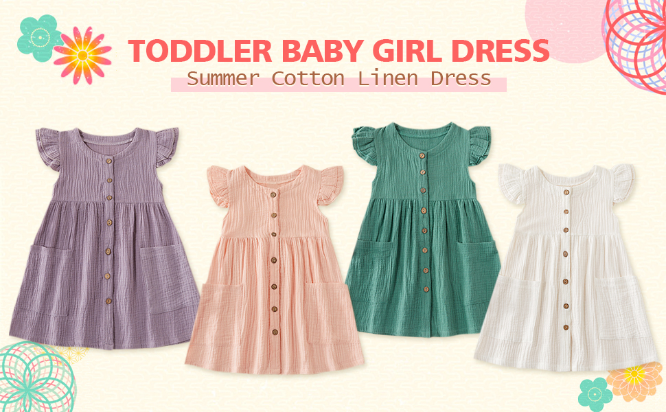 PATPAT Toddler Girl Dresses, Cotton Linen, Ruffle Sleeveless,White, Pink, Ginger, Purple,18-24 Months to 3-4 Years